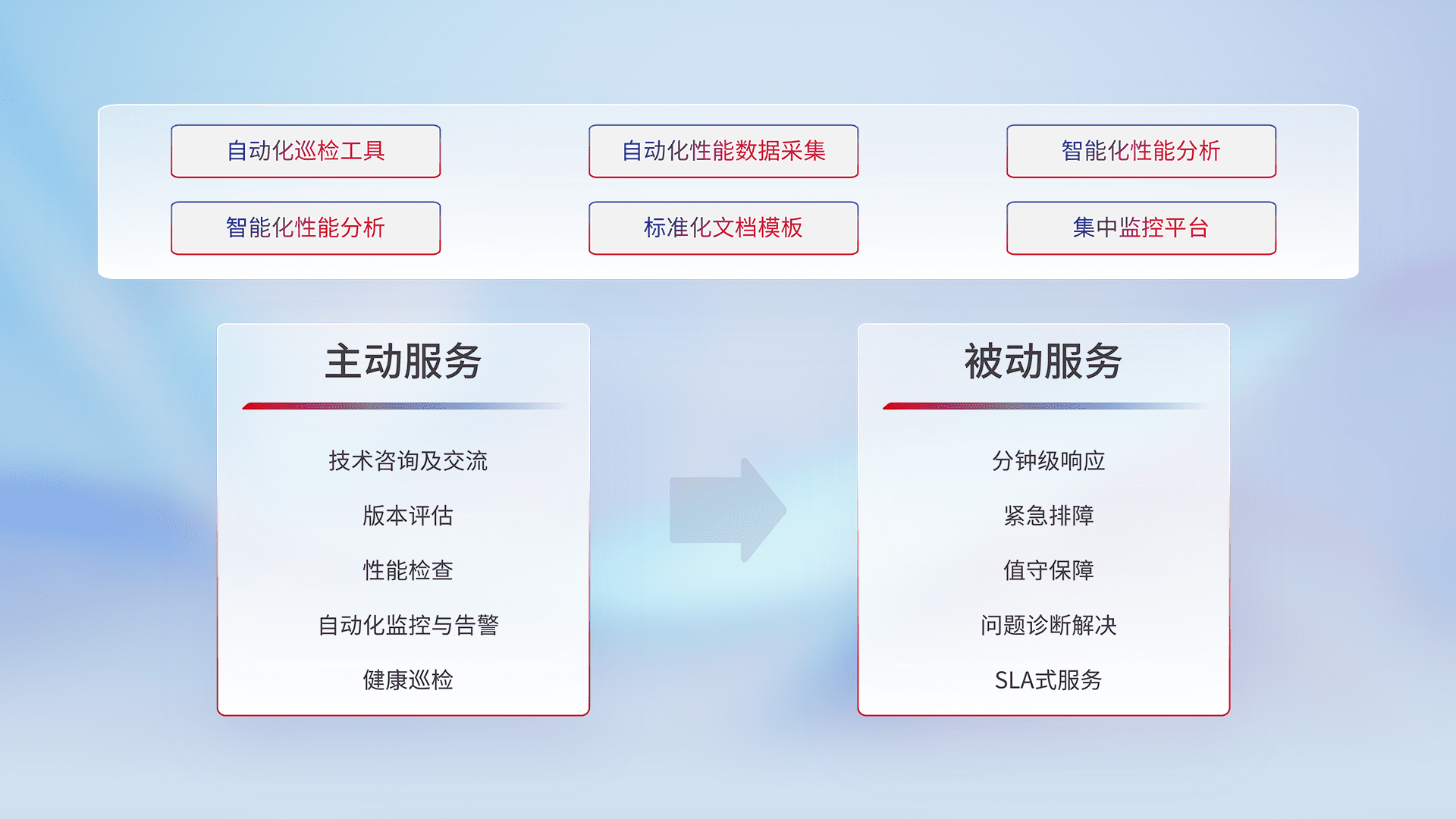 智能化工具和标准化文档,,,,保障服务质量,,提供主动服务(包含技术咨询、、、版本评估、、、、性能检查、、自动化监控与告警、、、健康巡检)和被动服务包含(分钟级响应、、、紧急排障、、值守保障、、、问题诊断解决、、、、SLA服务)。。